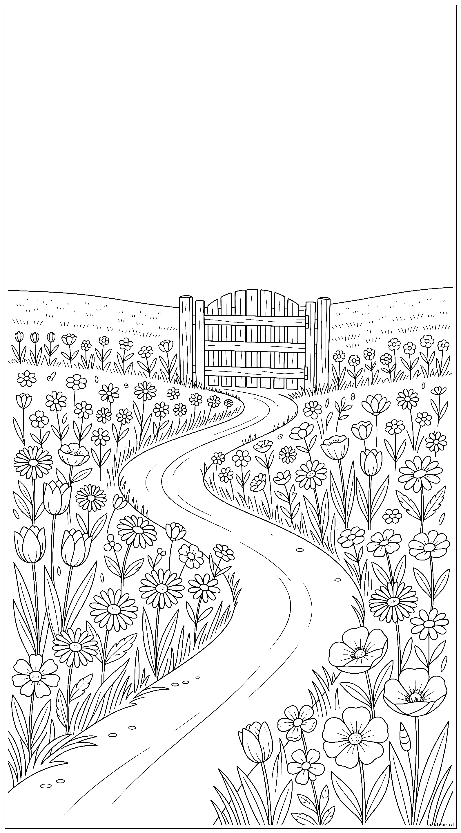 Bloemenveld met een kronkelend pad dat leidt naar een houten hekpoort