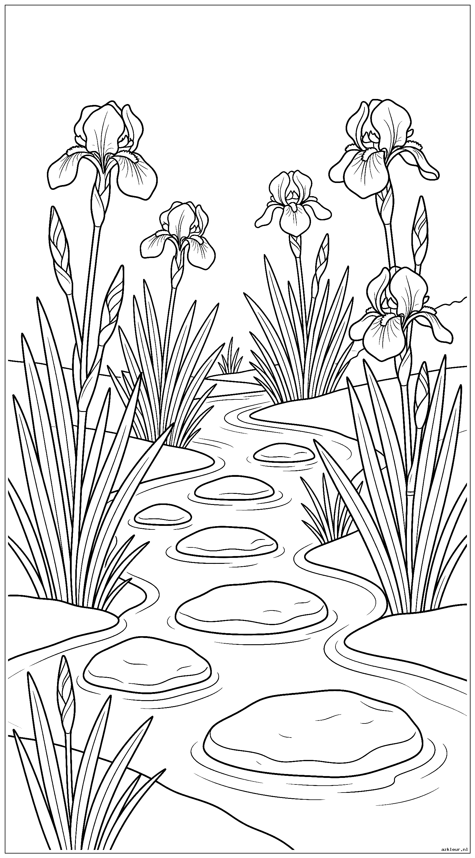 Irisbloemen groeien langs een beek met stapstenen die er doorheen lopen