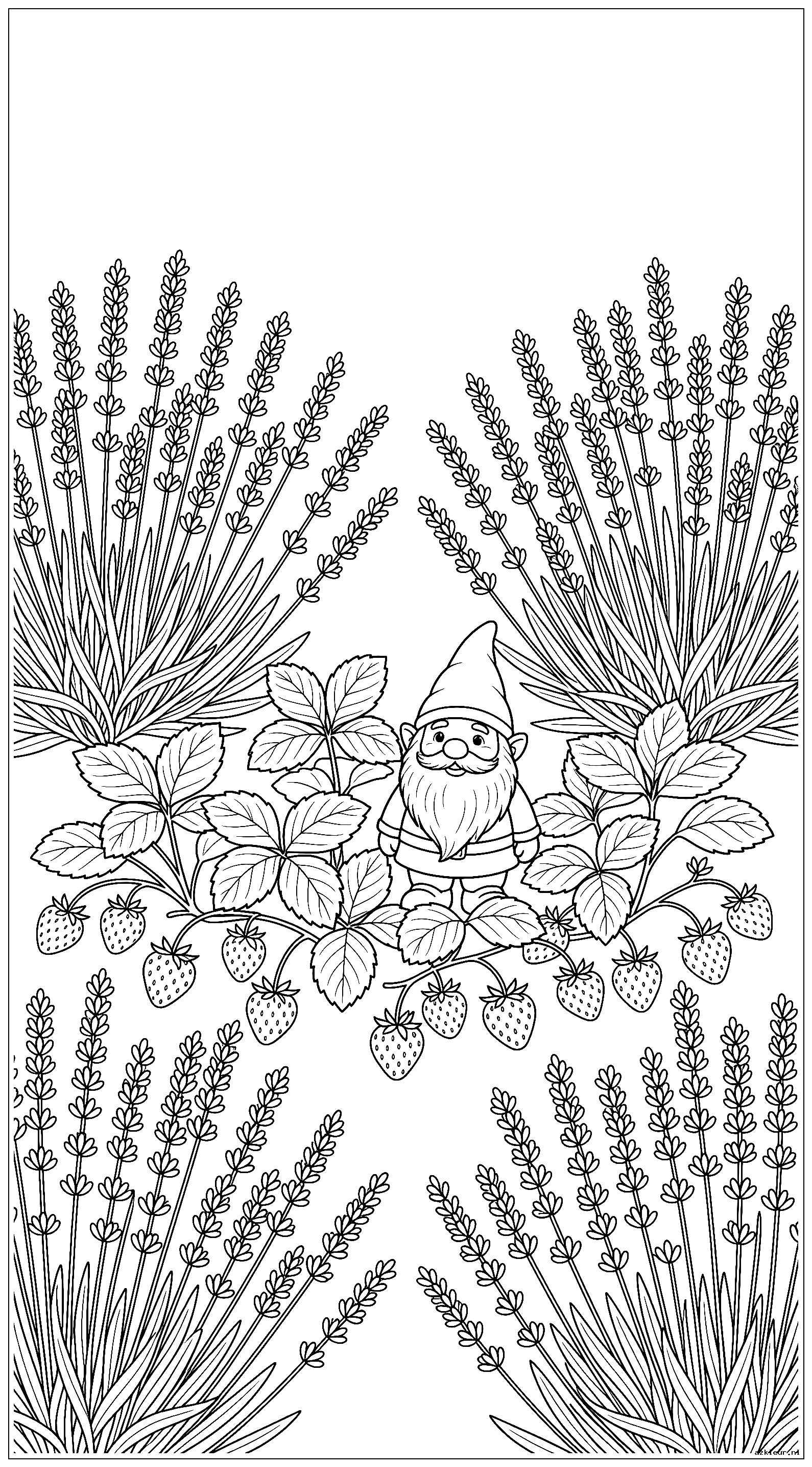 Lavendelstruiken rondom een ​​stukje aardbeiplanten met een tuinkabouter
