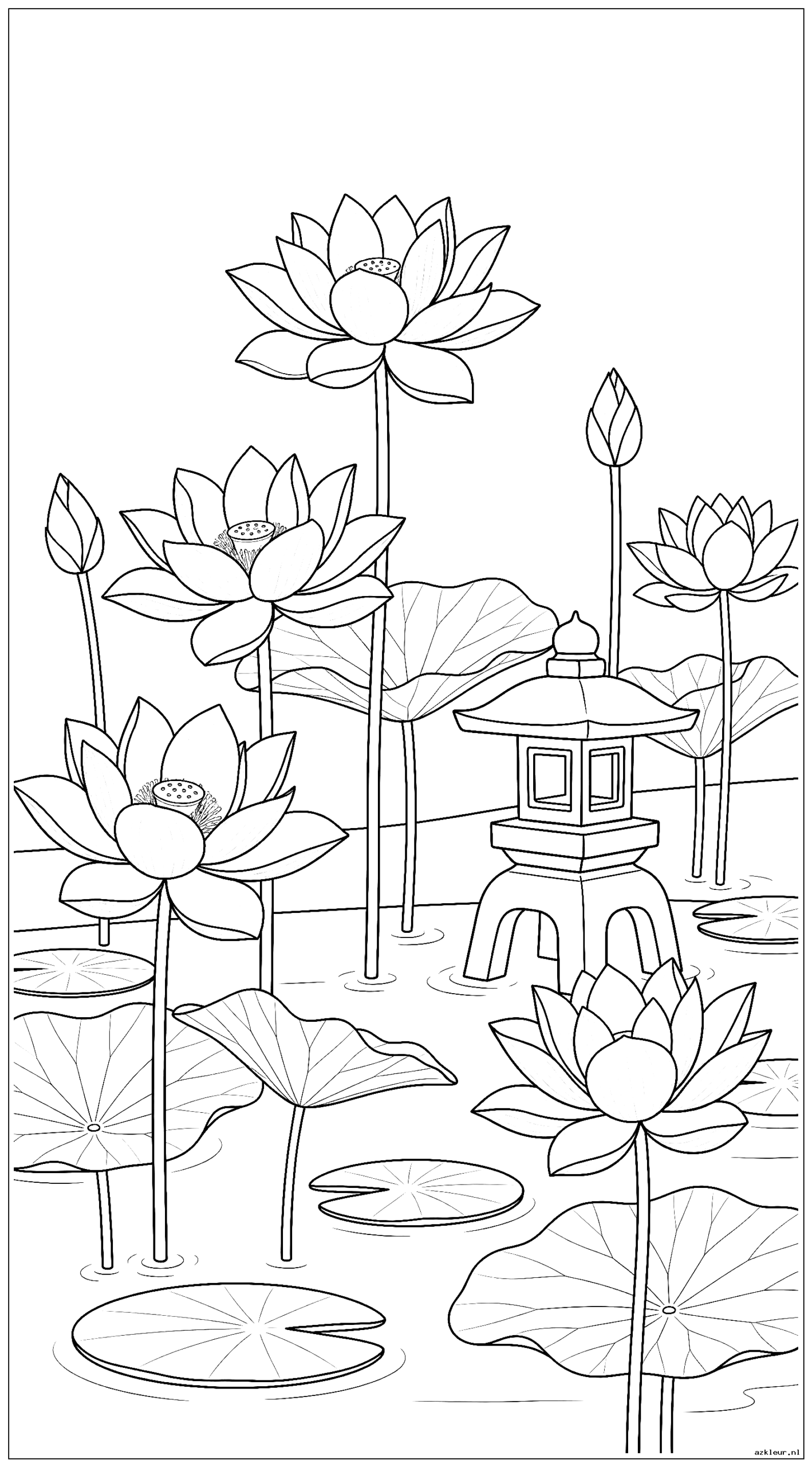 Lotusbloemen bloeien in een vijver met een decoratieve stenen lantaarn aan de kust