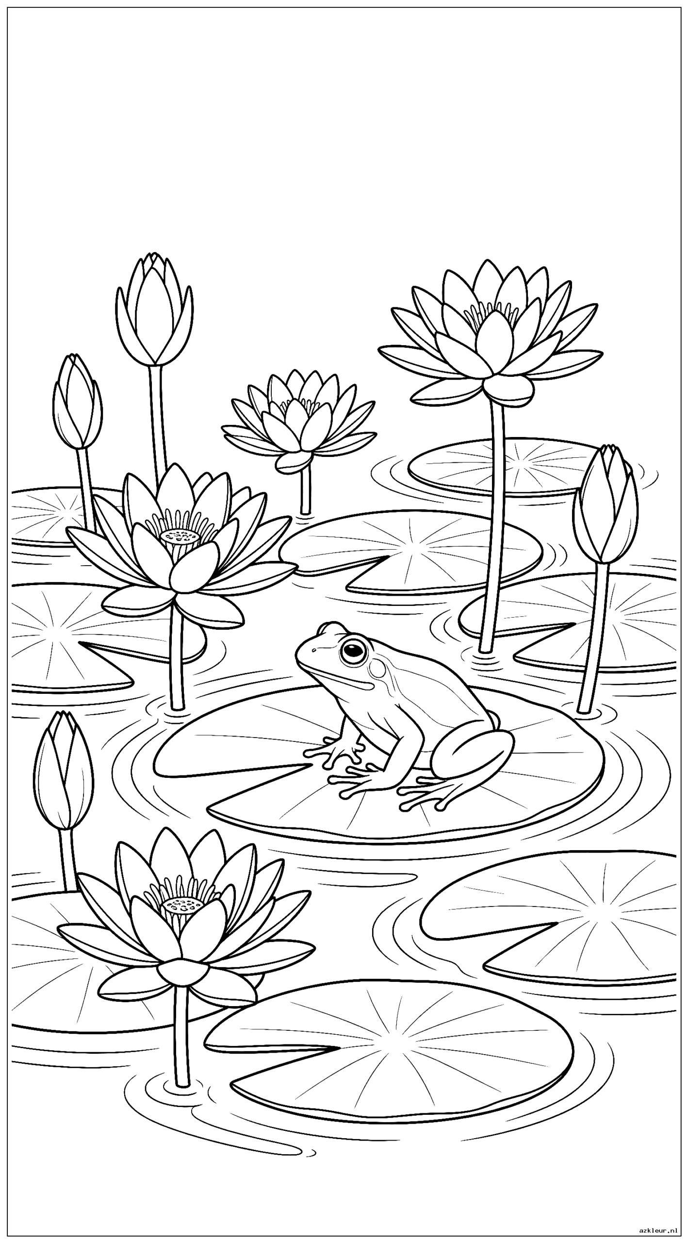 Waterlelies drijvend op een vijver met een kikker zittend op een lelieblad