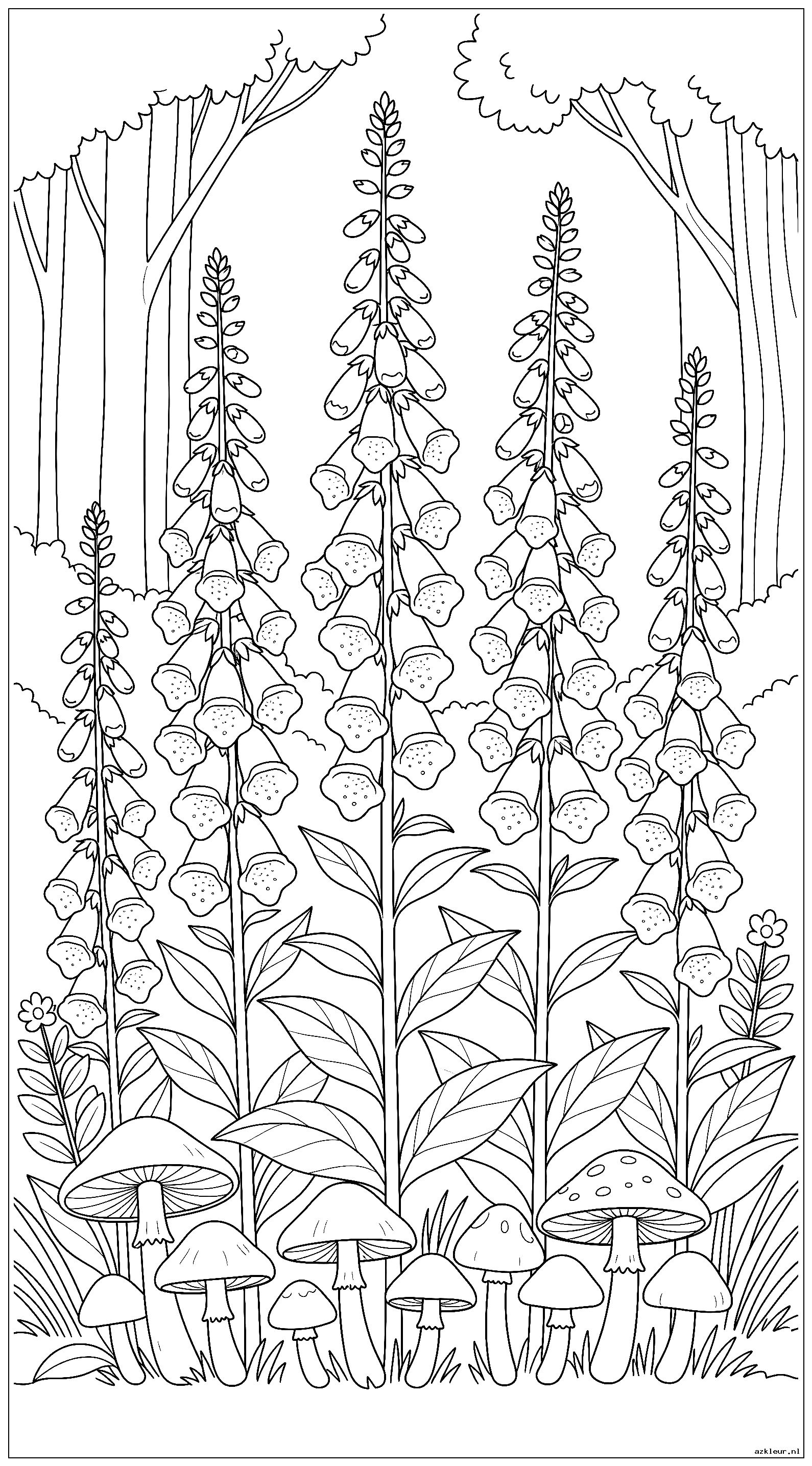 Wilde vingerhoedskruid groeit hoog tegen een bosrand met paddenstoelen aan de basis